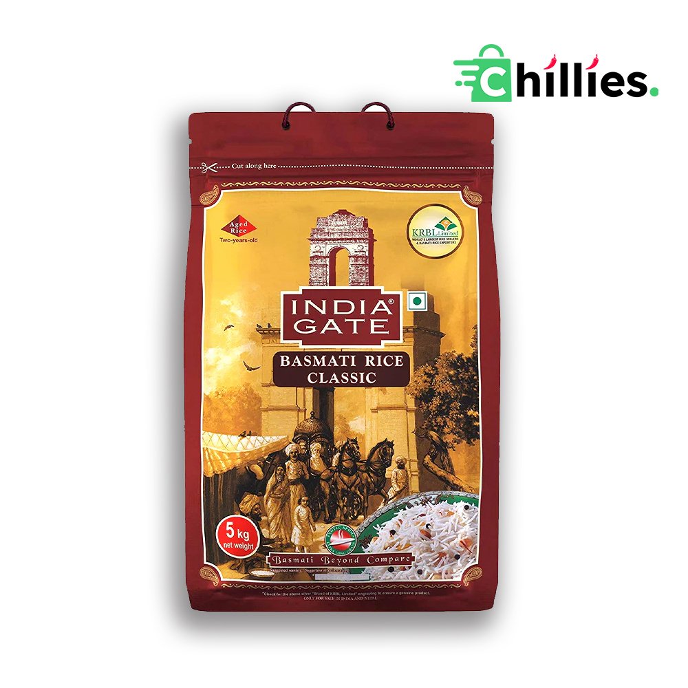 Experience the unique flavor and aroma of India Gate Classic Basmati White Rice. This premium 5kg pack brings you the essence of traditional Indian cuisine right to your kitchen. Sourced from the fertile plains of the Himalayas, each grain is aged to perfection, providing a delightful culinary experience.